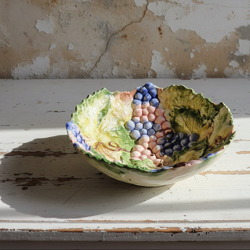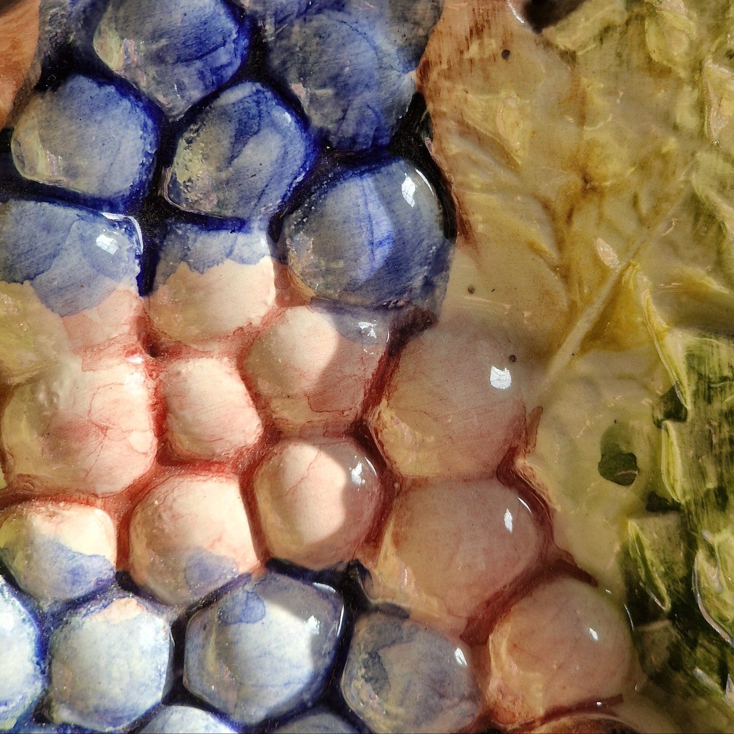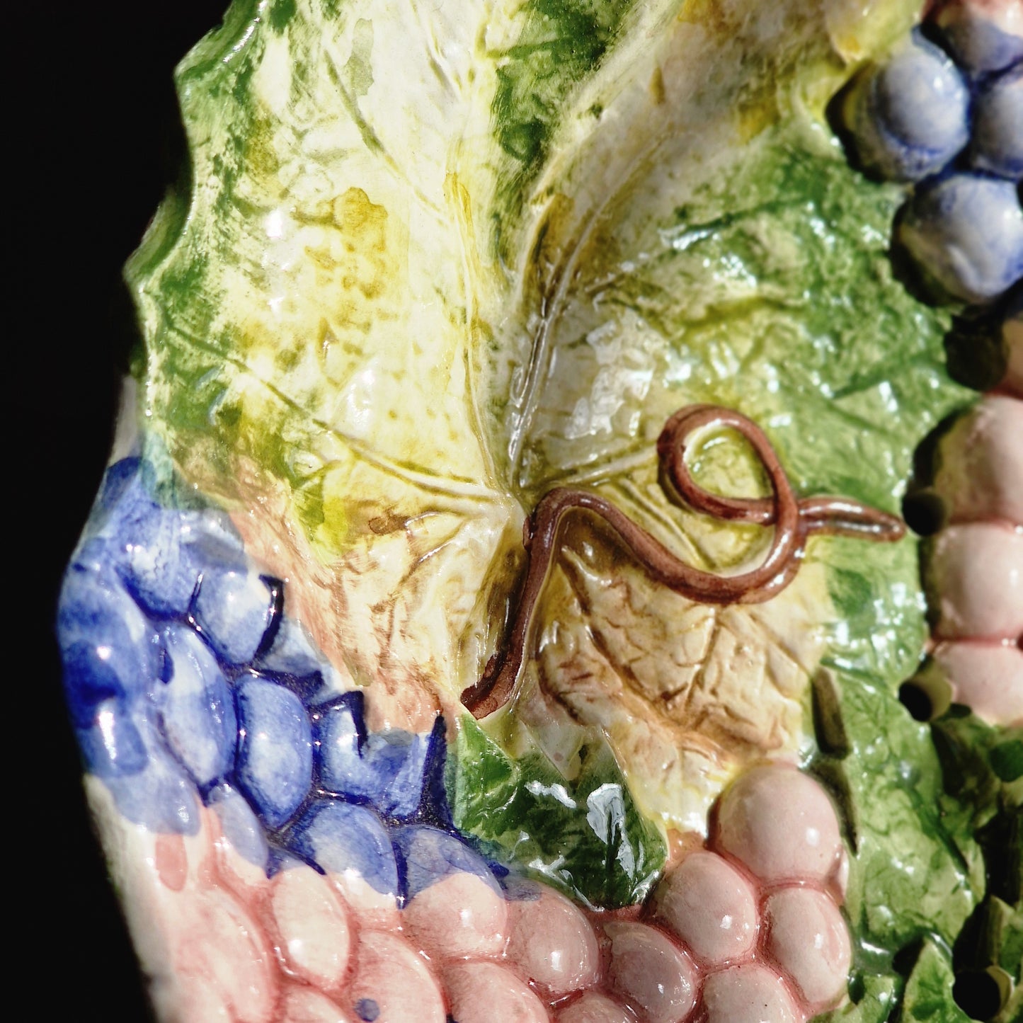 Smuk og dekorativ majolica skål med et klassisk motiv af drueklaser og vinblade i relief. Skålen er rigt modelleret, hvor blade, ranker og druer nærmest vokser ud af overfladen og skaber et levende og tredimensionelt udtryk.