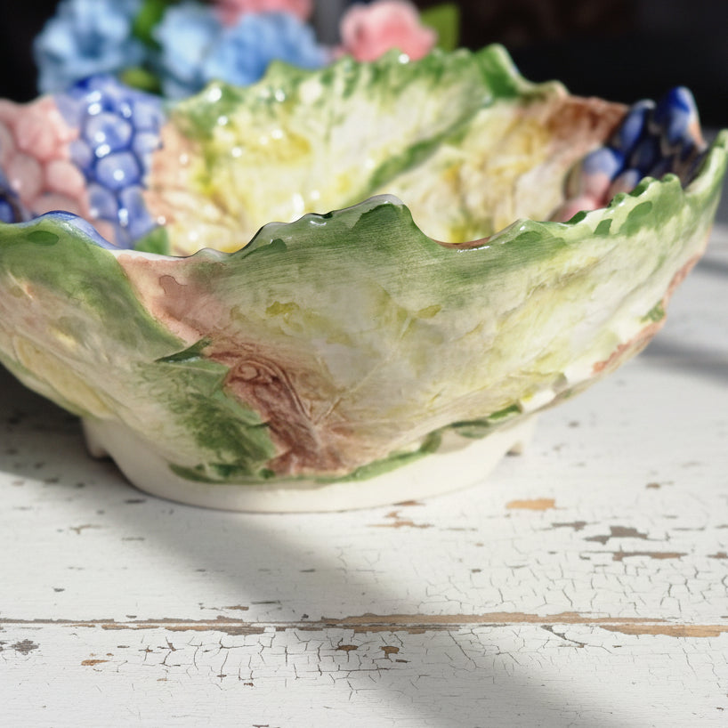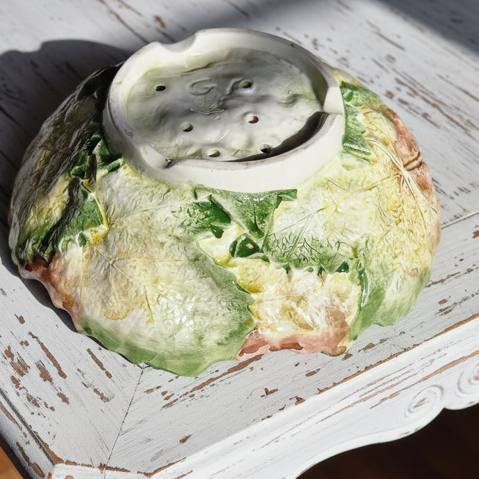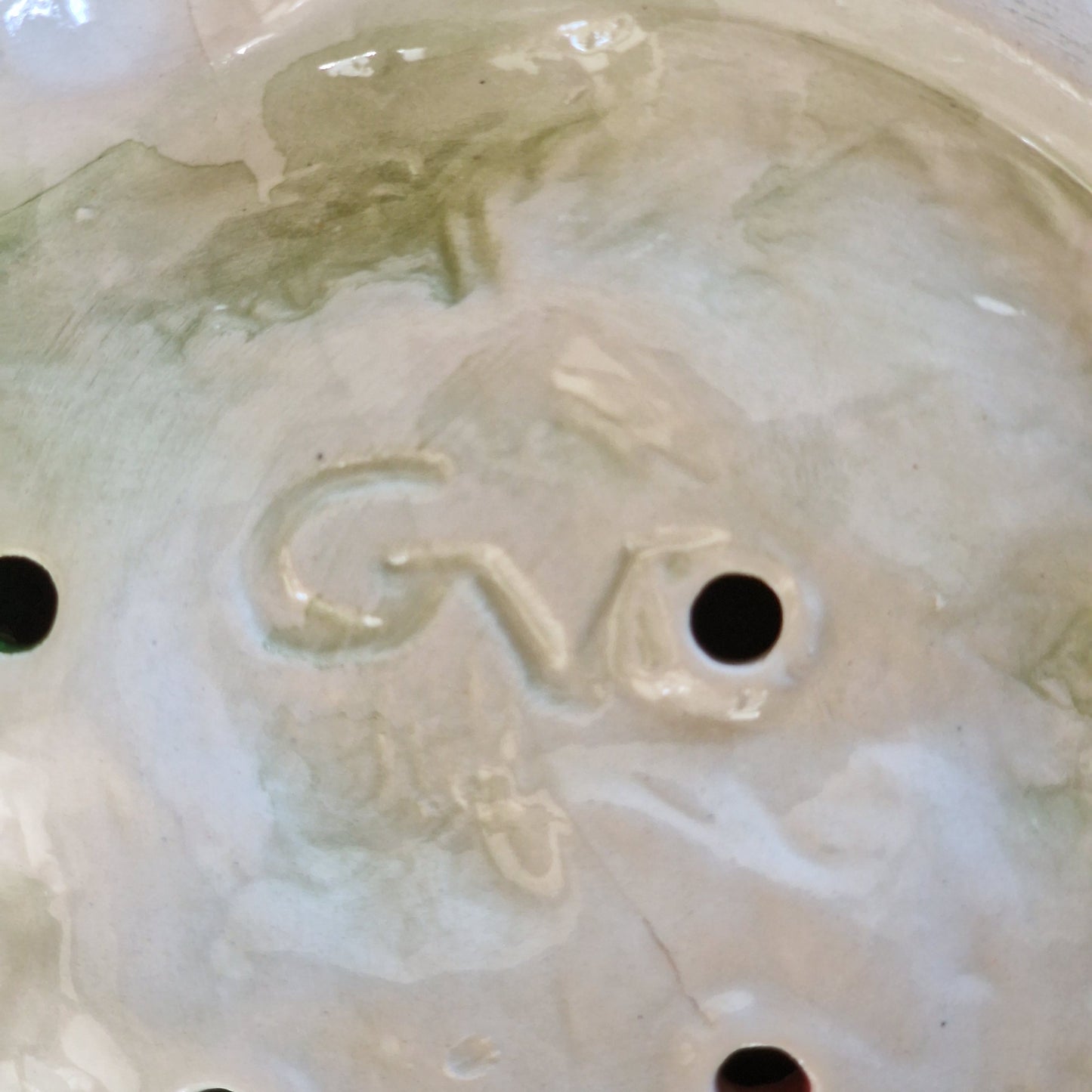 Skålen er udført i klassisk majolica og fremstår med den kraftige glasur og de naturinspirerede motiver, som er kendetegnende for sydeuropæisk keramiktradition. På undersiden ses et præget mærke, der fremstår som “GV”, hvilket sandsynligvis er et værksteds- eller modelstempel. Ud fra stil, glasur og udførelse vurderes skålen at være italiensk majolica fra midten af 1900-tallet.