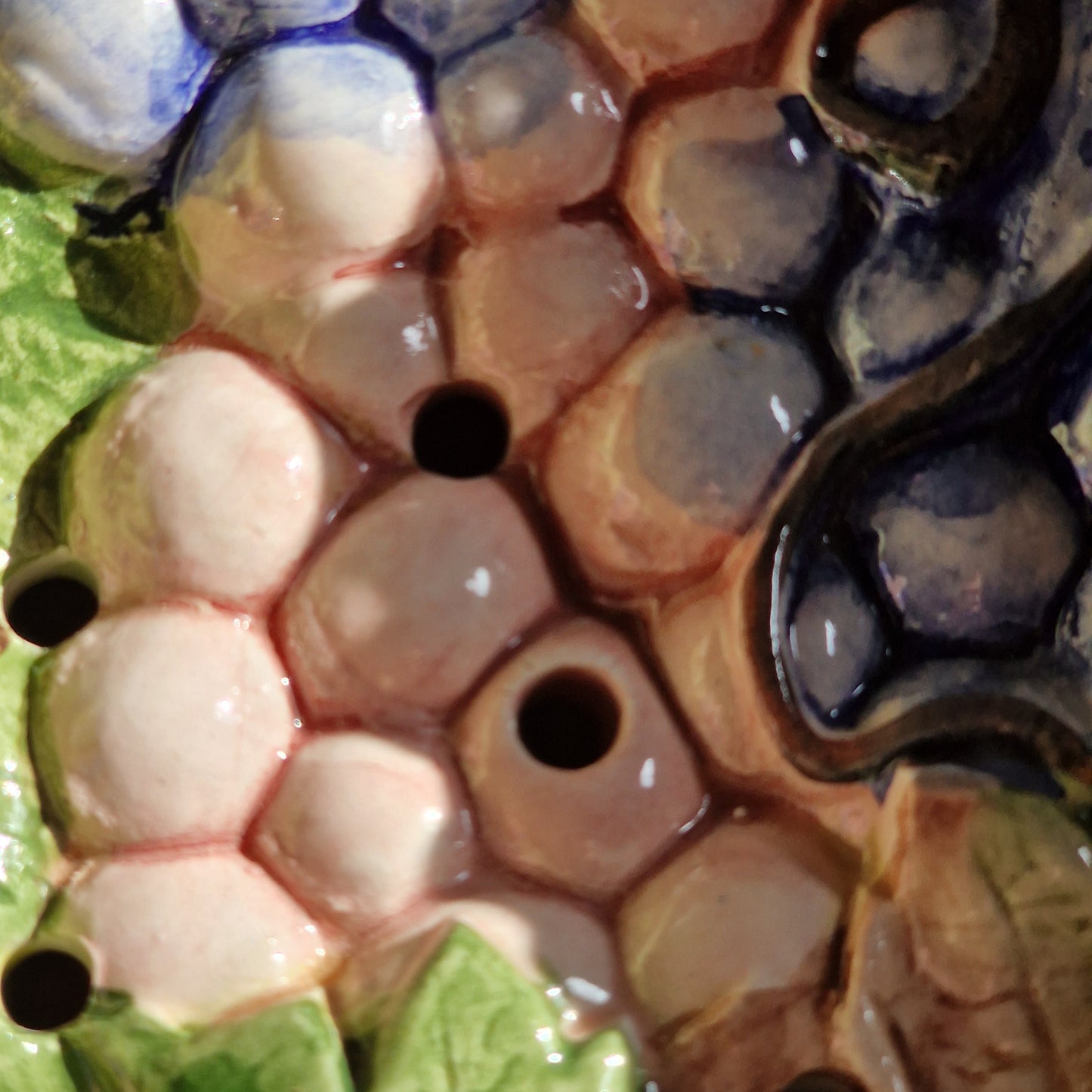 De karakteristiske majolica-farver i grønne, blå og rosa nuancer fremhæver detaljerne i bladene og drueklaserne og giver skålen et varmt og dekorativt udtryk. Glasuren har en flot dybde og glans, hvor lyset spiller smukt i de mange strukturer i keramikken.