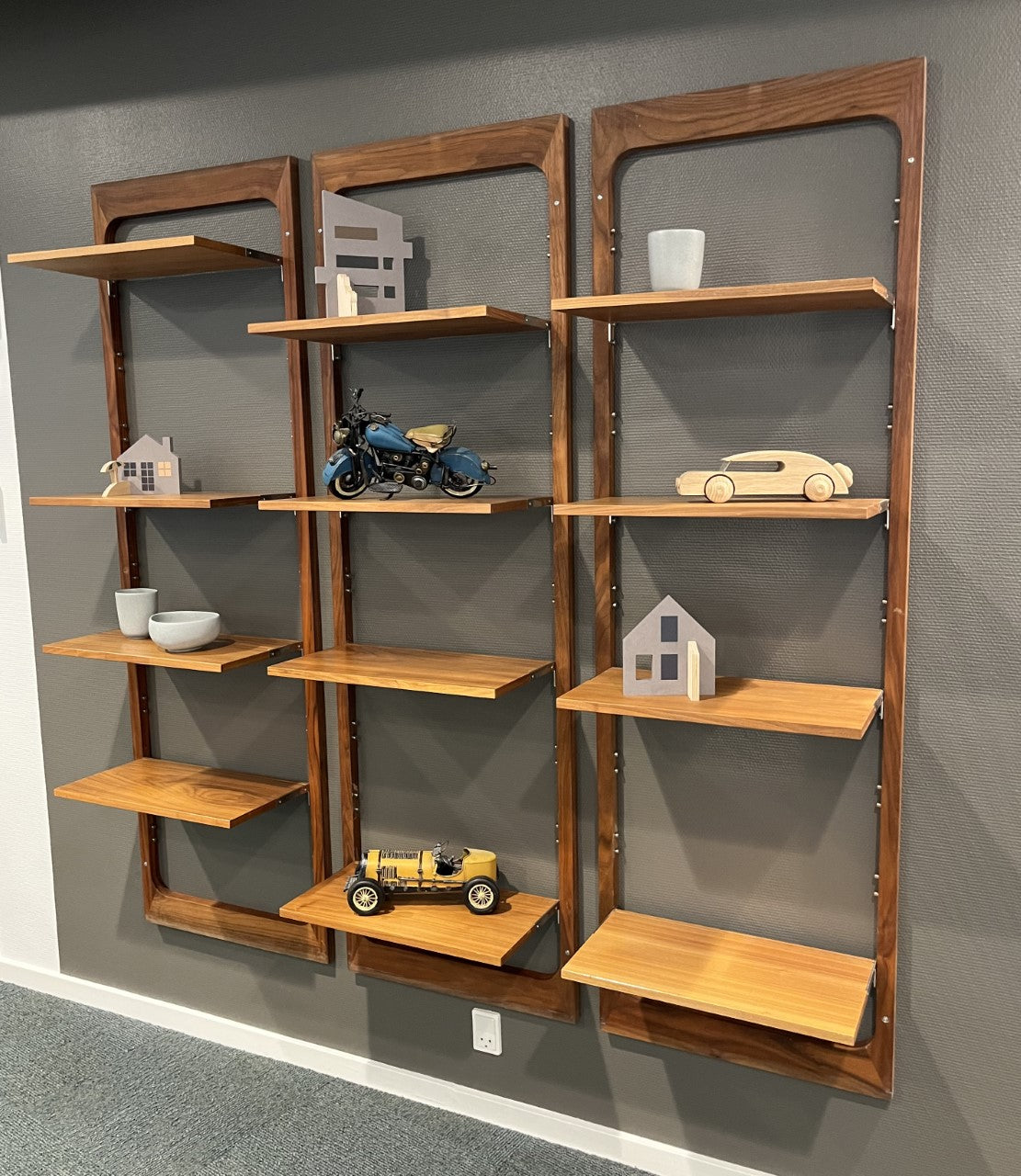 Væghængte reolsystemer blev særligt populære i midten af det 20. århundrede, hvor fleksibilitet og modulopbygning blev centrale elementer i moderne boligindretning. Denne type system giver mulighed for at tilpasse opstillingen efter behov og rum, samtidig med at den lette konstruktion bidrager til et mere åbent og luftigt udtryk. Anvendelsen af amerikansk valnød er karakteristisk for perioden og vidner om fokus på både kvalitet og æstetik.